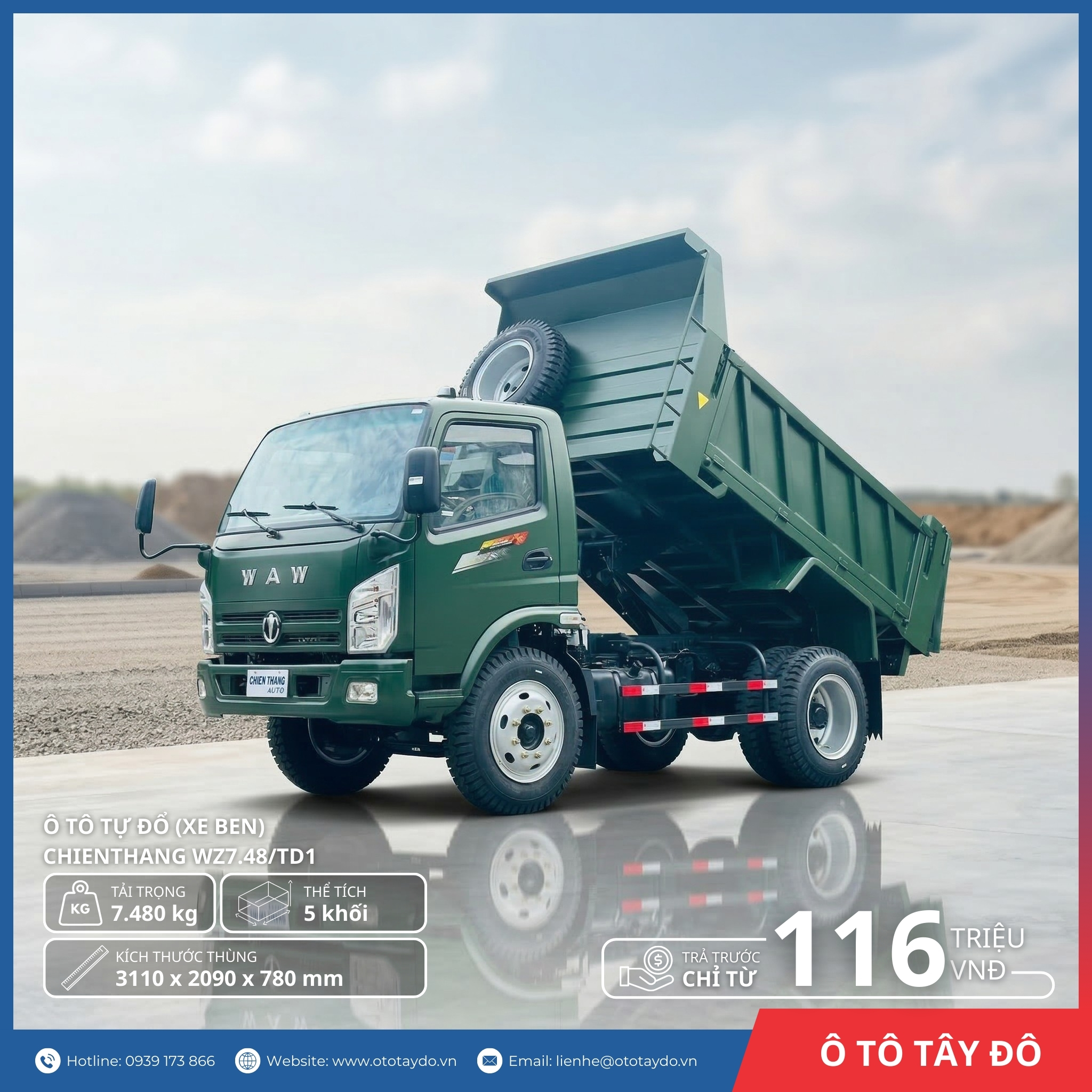 Nhu cầu vận chuyển vật liệu xây dựng khối lượng lớn tại Cần Thơ, Hậu Giang và các tỉnh lân cận luôn đòi hỏi những dòng xe ben bền bỉ, chở được nhiều hàng nhưng không quá cồng kềnh. Xe ben WAW Chiến Thắng 7.48 tấn (Mã kiểu loại: WZ7.48/TD1) chính là sự lựa chọn “vàng” trong phân khúc 7 – 8 tấn. Với tải trọng cao, kích thước thùng tối ưu, xe đáp ứng hoàn hảo các tiêu chí: chở khỏe, nhanh thu hồi vốn và hoạt động ổn định trên mọi địa hình.